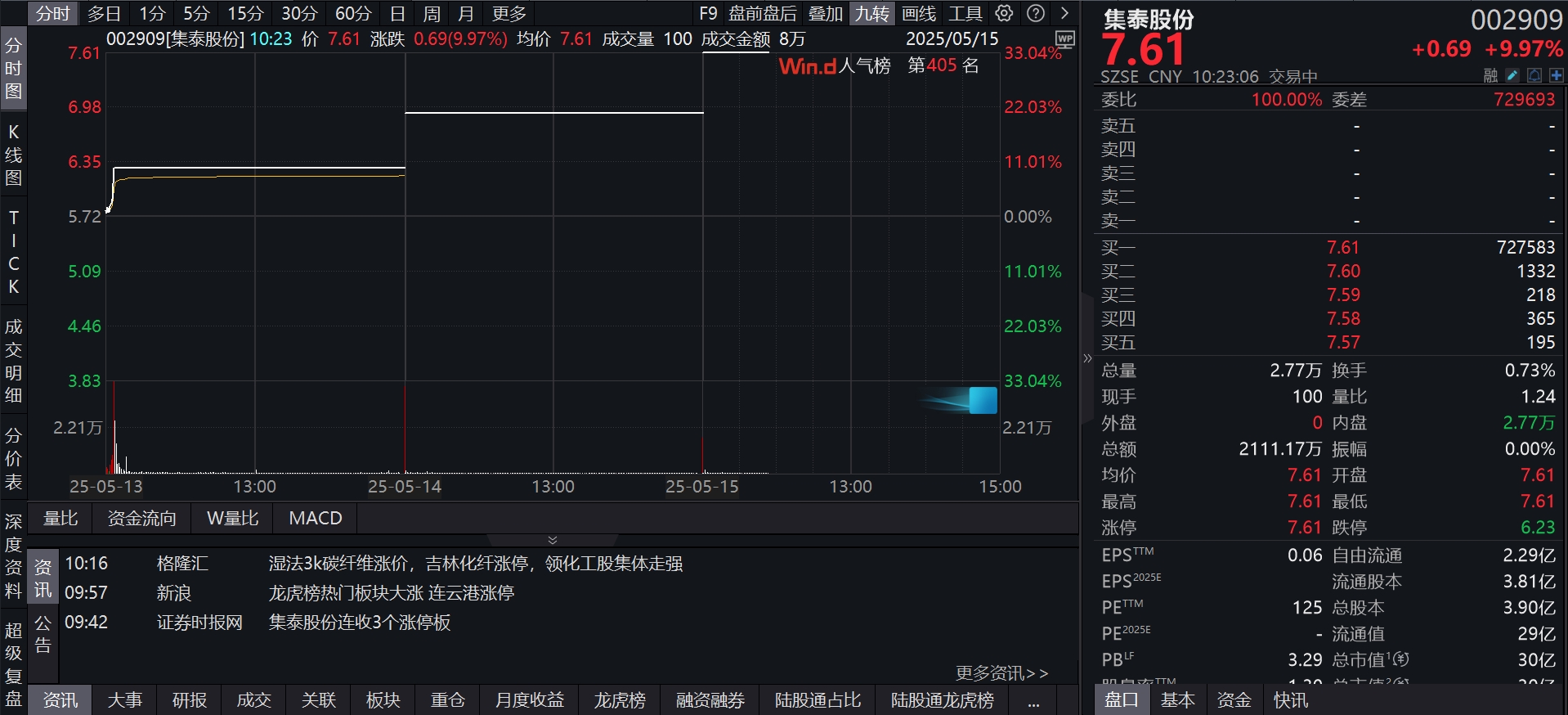 5月15日開盤后,廣州集泰化工股份有限公司(以下簡稱“集泰股份”,證券代碼:002909)“一字板”漲停,截至發(fā)稿封單約73萬手。