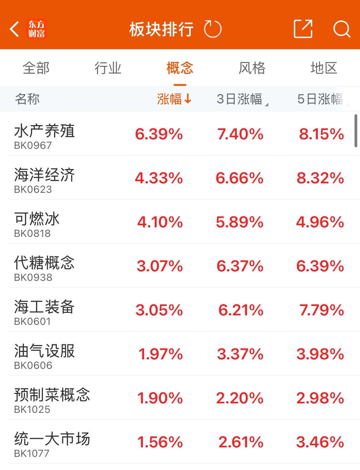 概念板塊中,海洋經(jīng)濟相關(guān)概念股全線爆發(fā)。截至上午收盤,東方財富行情軟件數(shù)據(jù)顯示,水產(chǎn)養(yǎng)殖、海洋經(jīng)濟、可燃冰、海工裝備、油氣設服等多個板塊大漲,分別漲6.39%、4.33%、4.10%、3.05%、1.97%。