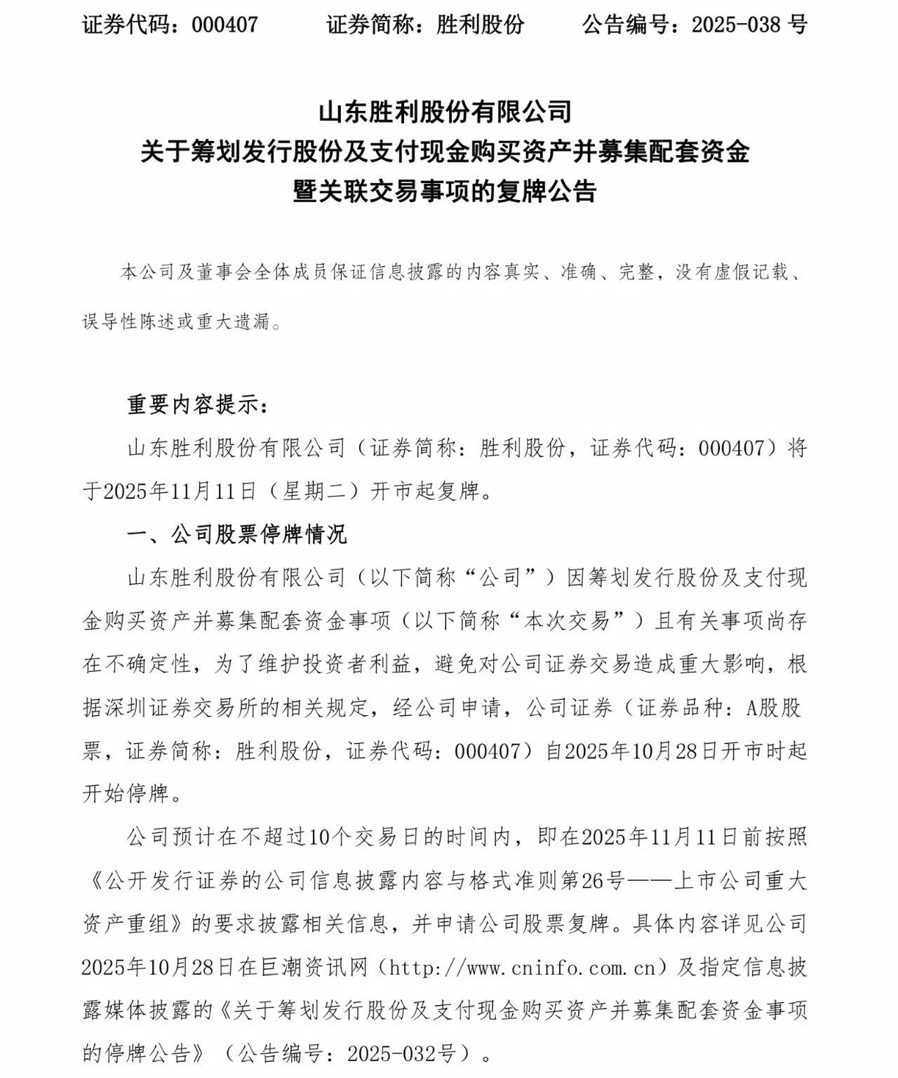 根據(jù)公告,勝利股份股票將于11月11日(星期二)開市起復牌。此前,勝利股份股票于10月28日起停牌。