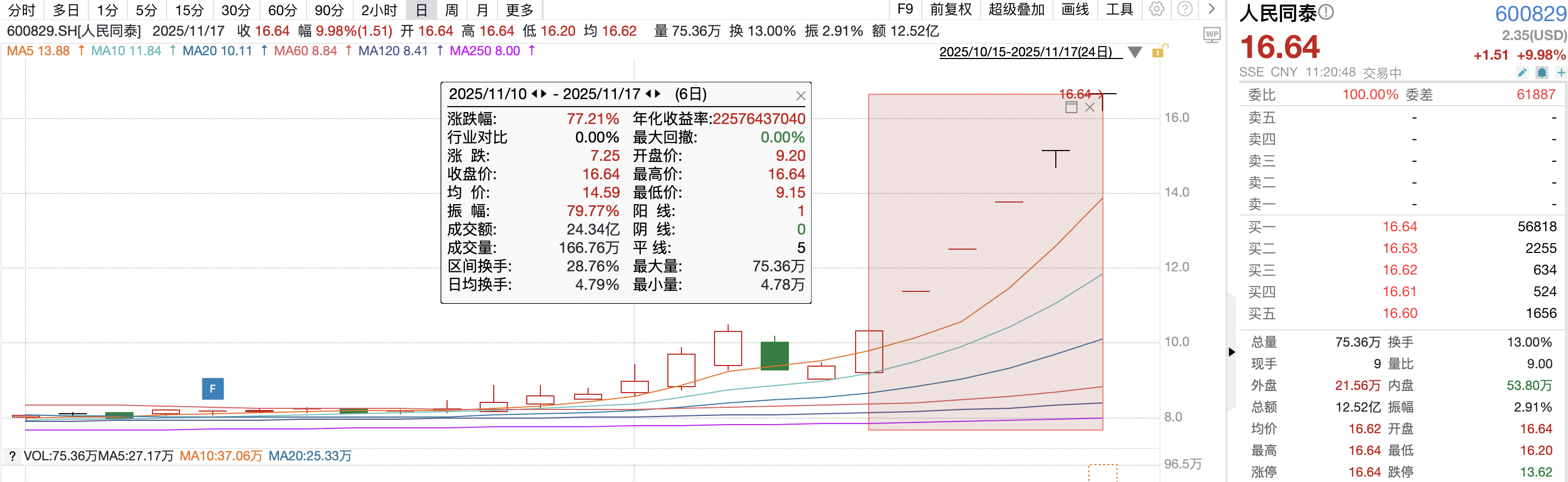 Wind數(shù)據(jù)顯示,截至11月17日午間收盤,人民同泰已連續(xù)6個(gè)交易日漲停,公司股價(jià)從11月10日的9.20元/股一路飆升至11月17日的16.64元/股,累計(jì)漲幅高達(dá)77.21%,總市值達(dá)到96億元。