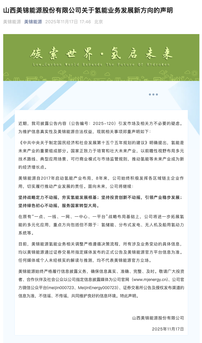 11月17日晚間,山西美錦能源股份有限公司(證券代碼:000723,證券簡(jiǎn)稱:美錦能源)在社交媒體發(fā)布聲明稱,該公司近期披露的一則公告內(nèi)容引發(fā)市場(chǎng)及相關(guān)方不必要的疑慮。為回應(yīng)各方關(guān)切,公司鄭重聲明,美錦能源自2017年啟動(dòng)氫能產(chǎn)業(yè)布局,8年來,公司始終積極發(fā)揮各區(qū)域鏈主企業(yè)作用,切實(shí)履行推動(dòng)產(chǎn)業(yè)發(fā)展的責(zé)任。面向未來,公司將繼續(xù):堅(jiān)持戰(zhàn)略定力不動(dòng)搖,夯實(shí)氫能發(fā)展根基;堅(jiān)持投資創(chuàng)新不動(dòng)搖,引領(lǐng)產(chǎn)業(yè)穩(wěn)步發(fā)展;堅(jiān)持綠色初心不動(dòng)搖,服務(wù)國(guó)家轉(zhuǎn)型大局。在原有“一點(diǎn)、一線、一網(wǎng)、一中心、一平臺(tái)”戰(zhàn)略布局基礎(chǔ)上,公司將進(jìn)一步拓展氫能的多元化應(yīng)用,重點(diǎn)方向包括但不限于:氫儲(chǔ)能、分布式發(fā)電、無人機(jī)及船用氫動(dòng)力系統(tǒng)等。
