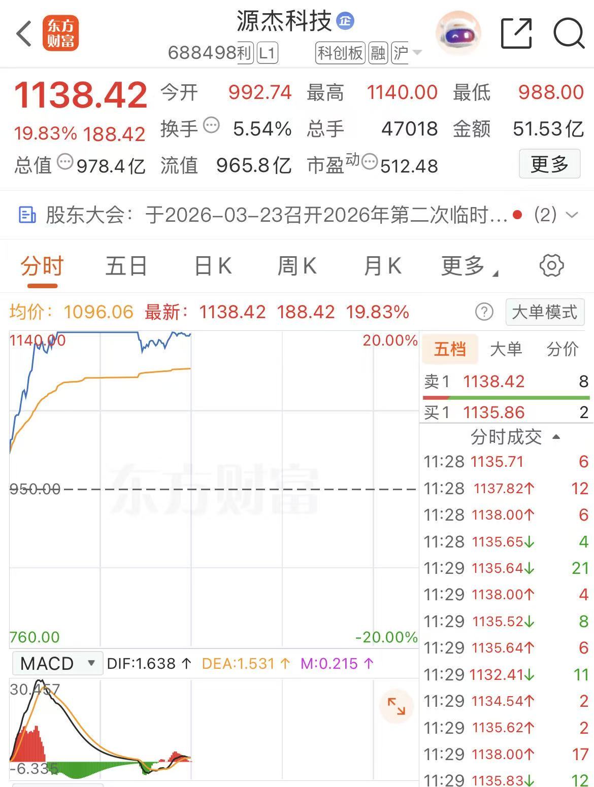 截至中午收盤,源杰科技收于1138.42元/股,上漲19.83%,成交額51.53億元,總市值逼近980億元,股價反超“寒王”寒武紀(jì),躍居A股市場第二高價股,僅次于貴州茅臺。