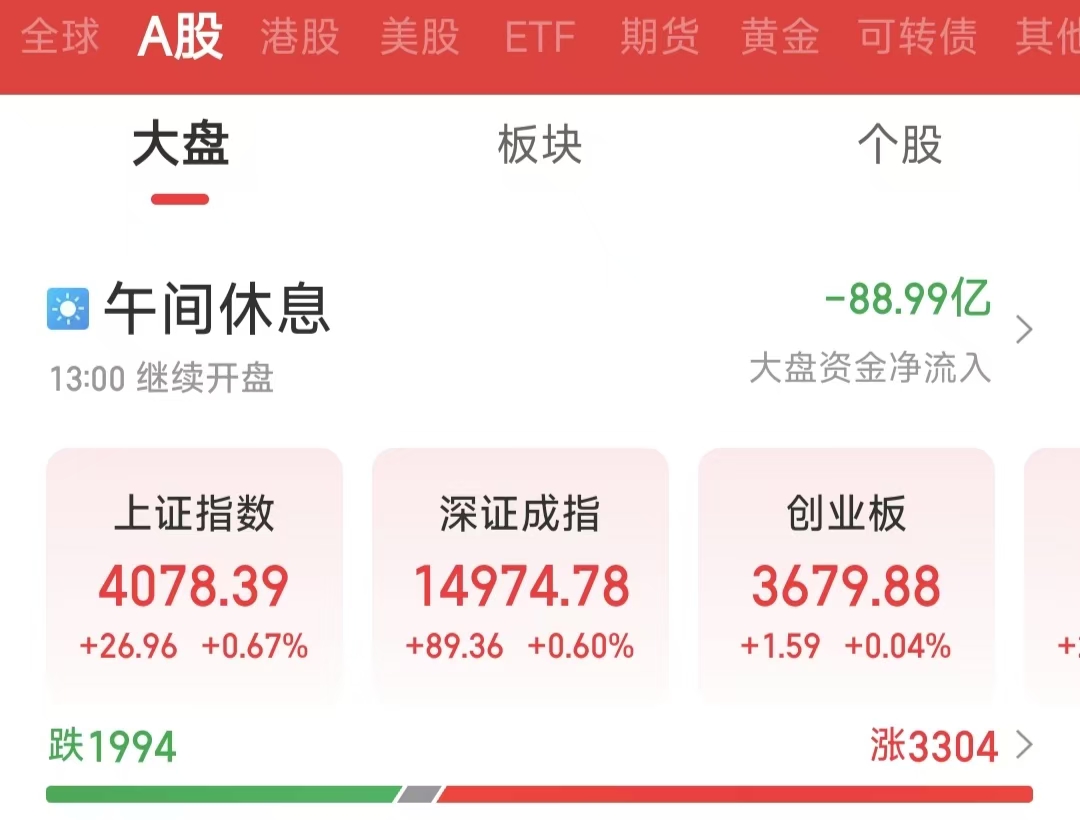 周一(4月20日)早盤市場高開震蕩、結(jié)構(gòu)分化。截至上午收盤,上證指數(shù)上漲0.67%,報4078.39點;深證成指上漲0.60%,報14974.78點;創(chuàng)業(yè)板指上漲0.04%,報3679.88點。滬深兩市合計成交額17058.95億元,成交金額持續(xù)放大??傮w來看,個股漲多跌少,共有3304只個股實現(xiàn)上漲。
