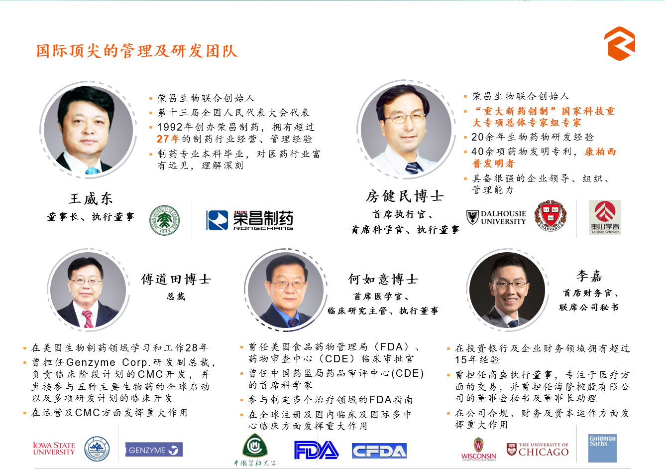 榮昌生物領先全球的研發(fā)管線背后,站著一個超級耀眼的明星團隊。除榮昌生物聯(lián)合創(chuàng)始人、CEO兼CSO房健民博士外,公司其他高管在諸如創(chuàng)新藥物研發(fā)、臨床開發(fā)、商業(yè)化等方面也都擁有成功經(jīng)驗。榮昌生物聯(lián)合創(chuàng)始人、董事長王威東,擁有超過30年的制藥行業(yè)經(jīng)營、管理經(jīng)驗,于1993年創(chuàng)立煙臺榮昌制藥股份有限公司,這是一家從事傳統(tǒng)中藥開發(fā)、生產(chǎn)及銷售的中國制藥公司,旗下?lián)碛懈靥┑戎放?。公司首席醫(yī)學官何如意博士是中國藥品臨床研發(fā)及全球監(jiān)管制度領域的權威專家,曾在美國FDA任職17年,之后被中國藥監(jiān)局以首席科學家身份特邀回國,熟知中國、美國及其他國家和地區(qū)的監(jiān)管審查規(guī)定及審批程序,在擔任國家藥監(jiān)局藥品審評中心首席科學家期間推動了中國多項重要的藥政改革。公司總裁傅道田博士在國際生物藥研發(fā)、項目與人員管理,包括生產(chǎn)工藝設計和研發(fā),分析平臺建立,質量標準認定和國際申報上擁有20多年的豐富經(jīng)驗,曾任麗珠醫(yī)藥副總裁及執(zhí)行董事,擔任過美國著名生物醫(yī)藥公司健贊研發(fā)副總裁,直接參與過5種主要生物藥的全球上市以及多項開發(fā)項目的臨床開發(fā)。