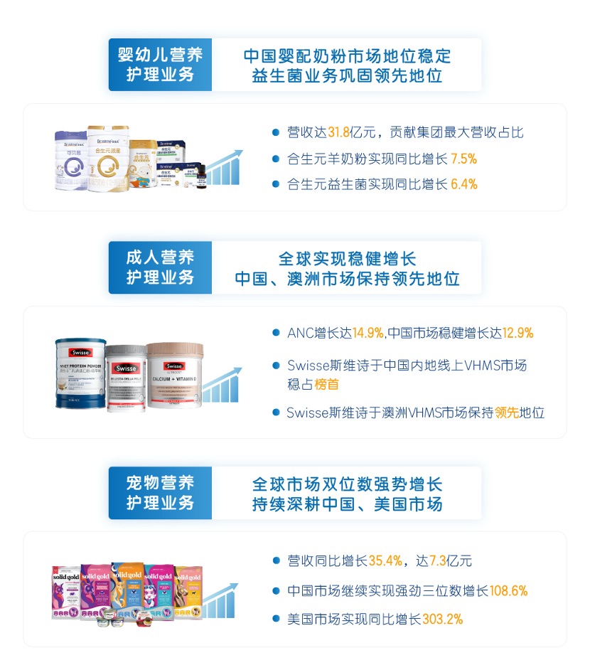 健合集團致力于全家庭營養(yǎng)健康。其中,嬰幼兒營養(yǎng)與護理用品業(yè)務(wù)(BNC)在中國嬰幼兒配方奶粉市場維持穩(wěn)定地位,益生菌業(yè)務(wù)實現(xiàn)6.4%增長,羊奶實現(xiàn)7.5%增長;成人營養(yǎng)與護理用品業(yè)務(wù)(ANC)同比實現(xiàn)14.9%穩(wěn)健增長,中國市場保持線上領(lǐng)先地位,為主要貢獻者,澳新市場實現(xiàn)穩(wěn)健增長;寵物營養(yǎng)與護理用品業(yè)務(wù)(PNC)營收7.3億元,同比實現(xiàn)增長35.4%。