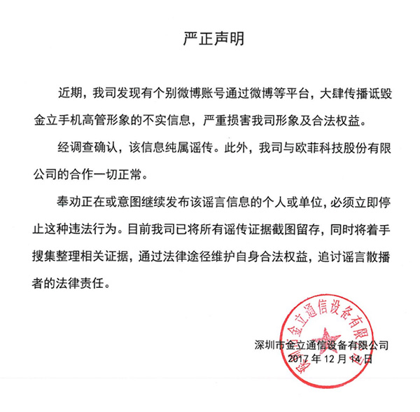“經(jīng)調(diào)查確認(rèn),該消息純屬謠傳,此外,我司與歐菲科技股份有限公司的合作一切正常。”金立同時稱,公司已將所有謠傳證據(jù)截圖留存,計劃用法律途徑維護(hù)自身合法權(quán)益。