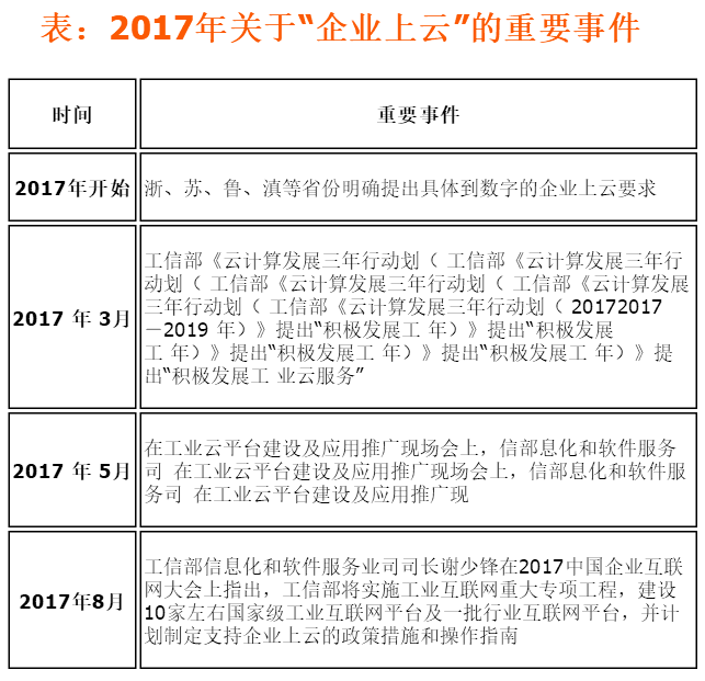 2017年起,工信部提出建設(shè)10家左右的國(guó)家級(jí)工業(yè)互聯(lián)網(wǎng)平臺(tái),并計(jì)劃制定支持企業(yè)上云的政策措施和操作指南。為響應(yīng)工信部號(hào)召,包括廣東、浙江、江蘇、山東、云南等在內(nèi)的多個(gè)省市紛紛推出了“企業(yè)上云”政策或規(guī)劃。其中,廣東將在2018年率先部署發(fā)展工業(yè)互聯(lián)網(wǎng),重點(diǎn)推動(dòng)3000家工業(yè)企業(yè)依托工業(yè)互聯(lián)網(wǎng)平臺(tái)實(shí)施數(shù)字化、網(wǎng)絡(luò)化、智能化升級(jí),帶動(dòng)6萬(wàn)家企業(yè)“上云上平臺(tái)”;浙江全面推進(jìn)“十萬(wàn)企業(yè)上云”,提出2017年全省新增上云企業(yè)10萬(wàn)家,培育國(guó)內(nèi)領(lǐng)先的云平臺(tái)服務(wù)商3-5家、行業(yè)云應(yīng)用平臺(tái)10個(gè)、云應(yīng)用服務(wù)商100家,形成典型標(biāo)桿應(yīng)用案例100個(gè)。