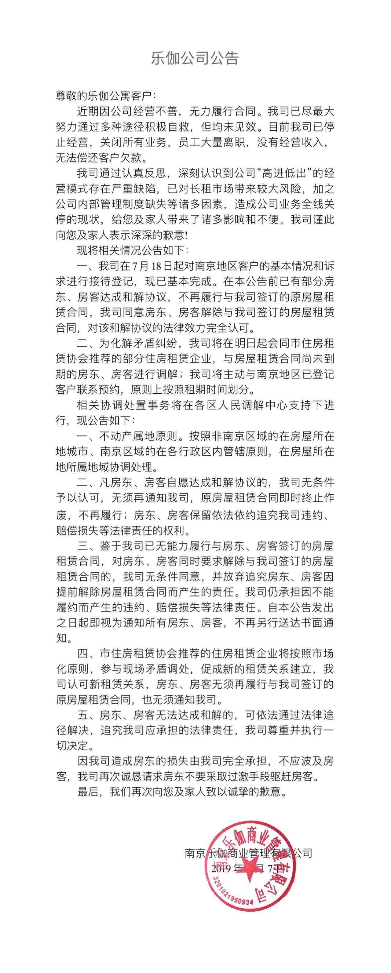 據(jù)悉,樂伽公司通過微信公眾平臺(tái)發(fā)布一則公告,確認(rèn)公司已停止經(jīng)營(yíng)。樂伽公司表示,公司“高進(jìn)低出”的經(jīng)營(yíng)模式存在嚴(yán)重缺陷,已對(duì)長(zhǎng)租市場(chǎng)帶來較大風(fēng)險(xiǎn),加之公司內(nèi)部管理制度缺失等諸多因素,造成公司業(yè)務(wù)全線關(guān)停現(xiàn)狀。