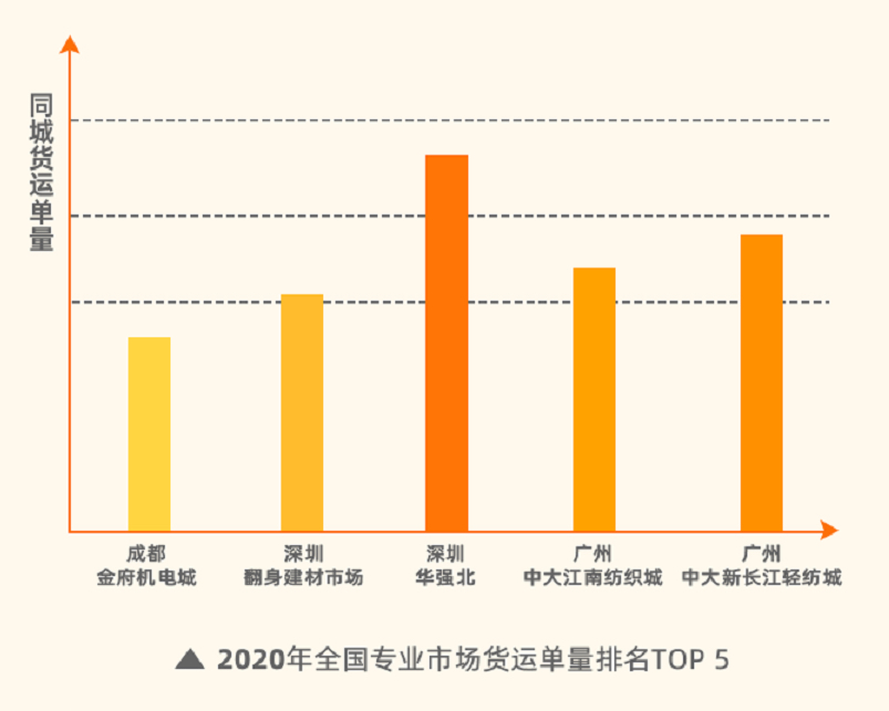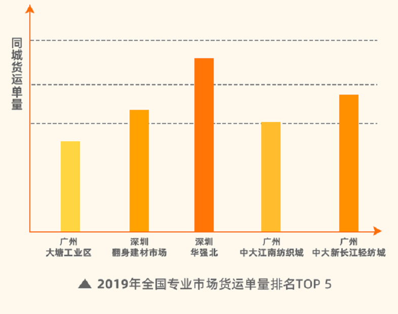 2019-2021年,華強(qiáng)北在全國(guó)專(zhuān)業(yè)市場(chǎng)同城貨運(yùn)單量排名里蟬聯(lián)第一,廣州中大新長(zhǎng)江輕紡城則穩(wěn)居第二。其中,廣州重大江南紡織城、深圳翻身建材市場(chǎng)也連續(xù)3年進(jìn)入排名前5名,貨運(yùn)量穩(wěn)定。