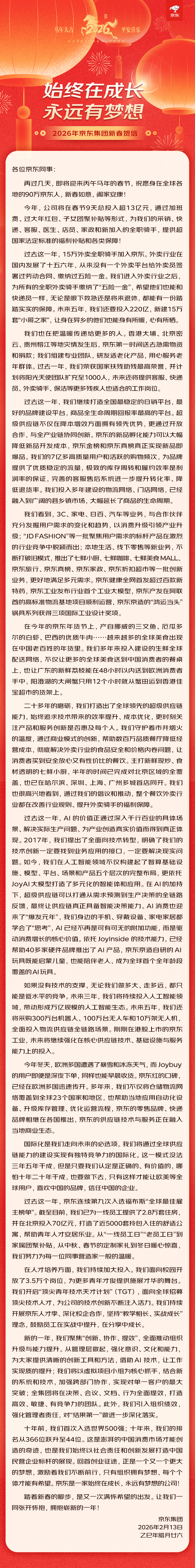 本報訊 (記者梁傲男)2月13日,京東集團(tuán)面向全球90萬京東人發(fā)布新春賀信,今年的新春賀信以《始終在成長,永遠(yuǎn)有夢想》為主題,全文如下: