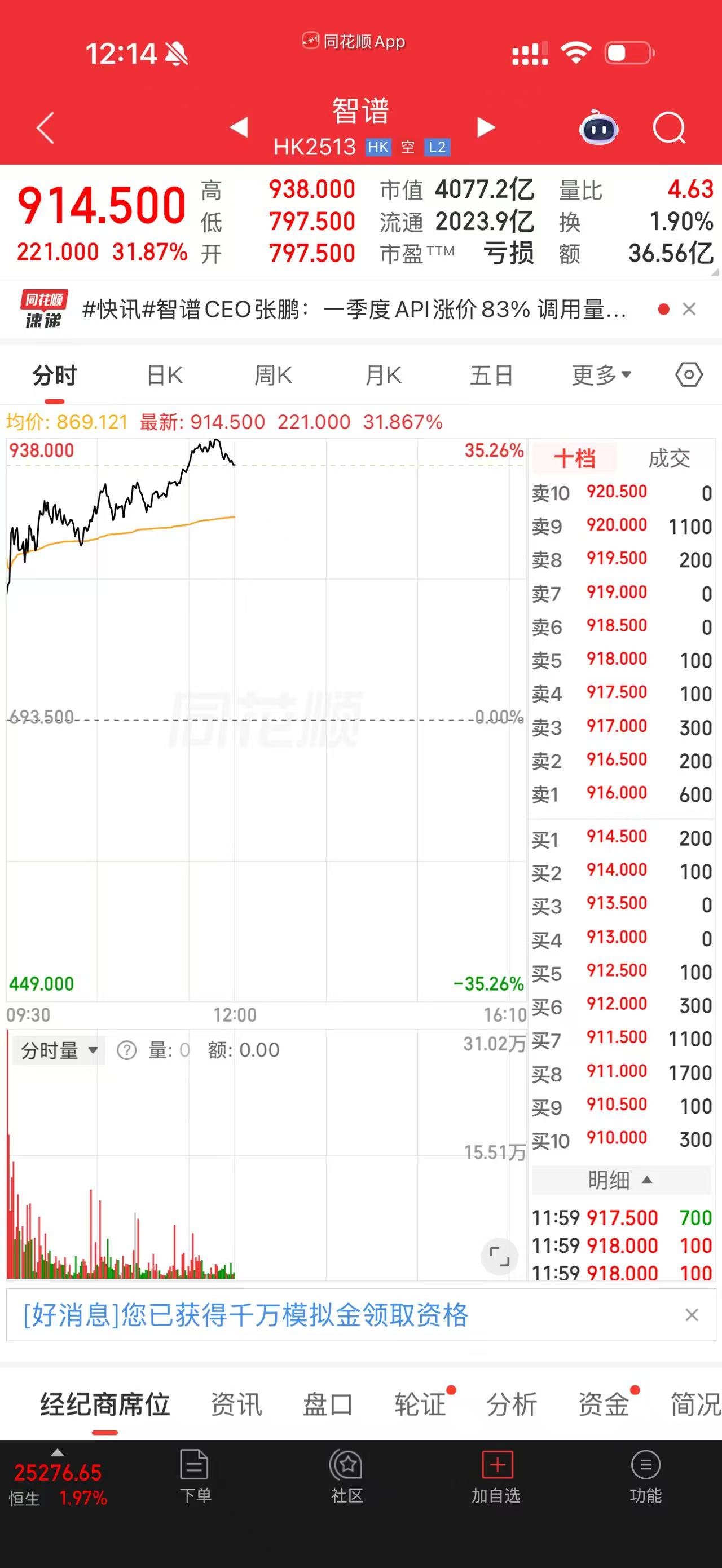 4月1日早盤,北京智譜華章科技股份有限公司(以下簡稱“智譜”,股票代碼“HK2513”)股價大漲。盤中最高漲超35%,觸及每股938港元,續(xù)刷歷史新高。截至上午收盤,智譜股價為每股914.5港元,上漲31.87%,總市值達4077.2億港元。