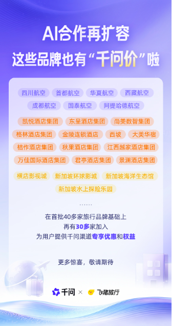 與千問和飛豬達(dá)成AI合作的旅行品牌迅速擴(kuò)充。一個多月前,千問和飛豬宣布與包括中國東方航空、中國南方航空、萬達(dá)酒店及度假村、上海迪士尼度假區(qū)等在內(nèi)的40多個旅行品牌達(dá)成AI合作。兩波累計超80家合作品牌將為千問用戶提供包括折扣價、立減券、酒店早餐及延遲退房等在內(nèi)的優(yōu)惠或權(quán)益,單件商品最高立減300元。