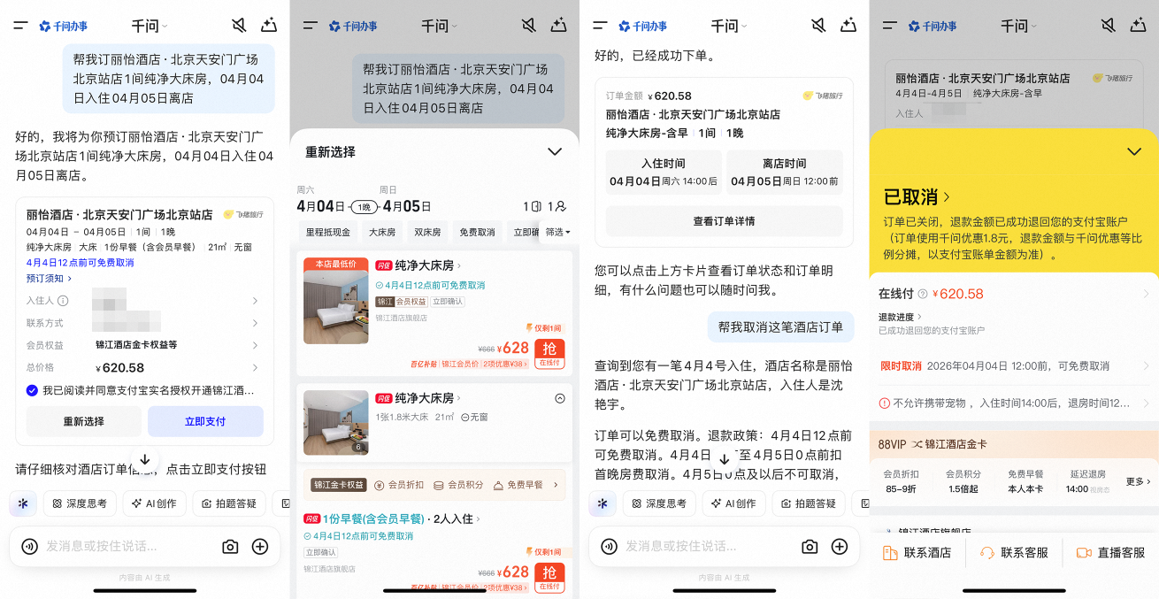 千問APP深度接入飛豬,AI訂旅行的體驗日益提升,用戶的旅行探索、預(yù)訂和售后服務(wù)更加豐富和專業(yè)。目前,一批新功能正在逐步開放測試體驗,用戶可以通過對話在千問APP內(nèi)便捷選擇酒店房型、一鍵付款,還能讓千問修改已經(jīng)生成的訂單、幫忙退訂、查詢退款進(jìn)度等。