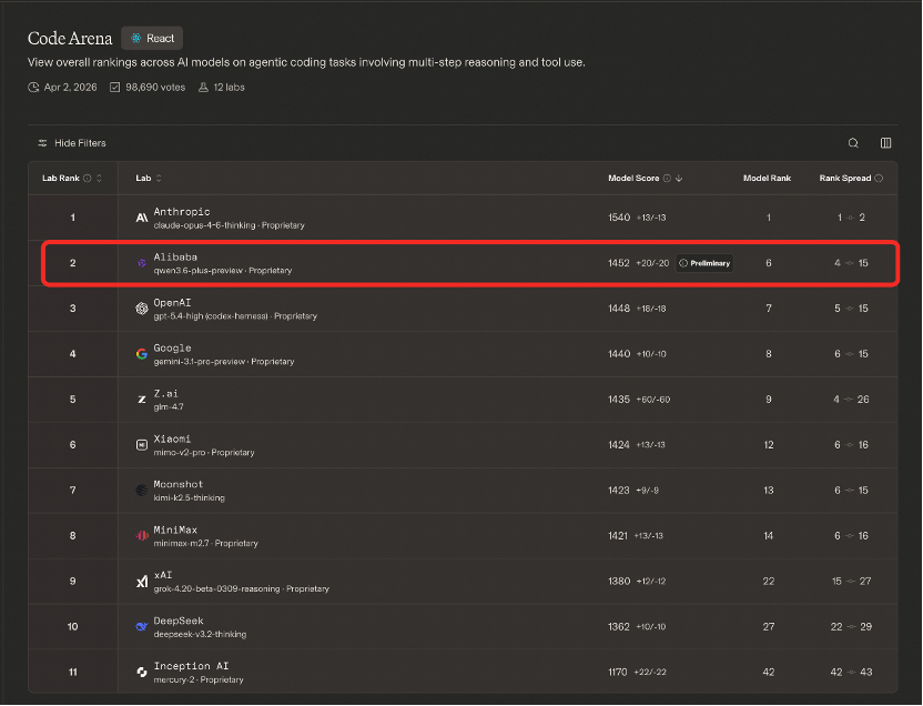 本報(bào)訊 (記者梁傲男)4月3日,全球知名大模型盲測(cè)榜單LMArena旗下聚焦AI編程能力的Code Arena公布新一期排名,阿里巴巴最新一代大語(yǔ)言模型Qwen3.6-Plus登上全球榜單第二,超越OpenAI、Google、xAI等國(guó)際巨頭,成為該榜單上排名最高的中國(guó)大模型。