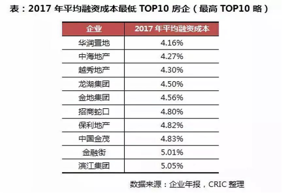 借此,2017年龍湖的平均借貸成本進一步降低至年利率4.5%,平均貸款年限5.92年,達到歷史最優(yōu)水平。在2017年平均融資成本最低的民營房企中,龍湖位居第一。
