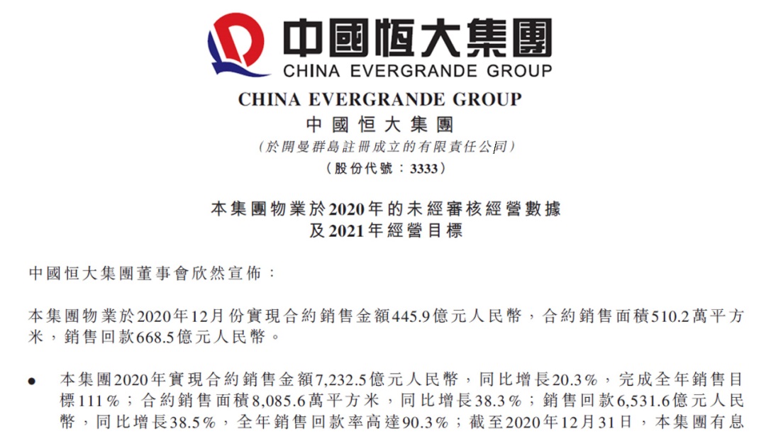 1月5日,中國恒大(3333.HK)發(fā)布公告稱,2020年全年集團(tuán)實(shí)現(xiàn)銷售7232.5億元,同比增長20.3%,完成全年銷售目標(biāo)111%;銷售面積8085.6萬平方米,同比增長38.3%;銷售回款6531.6億元,同比增長38.5%,全年回款率90.3%。