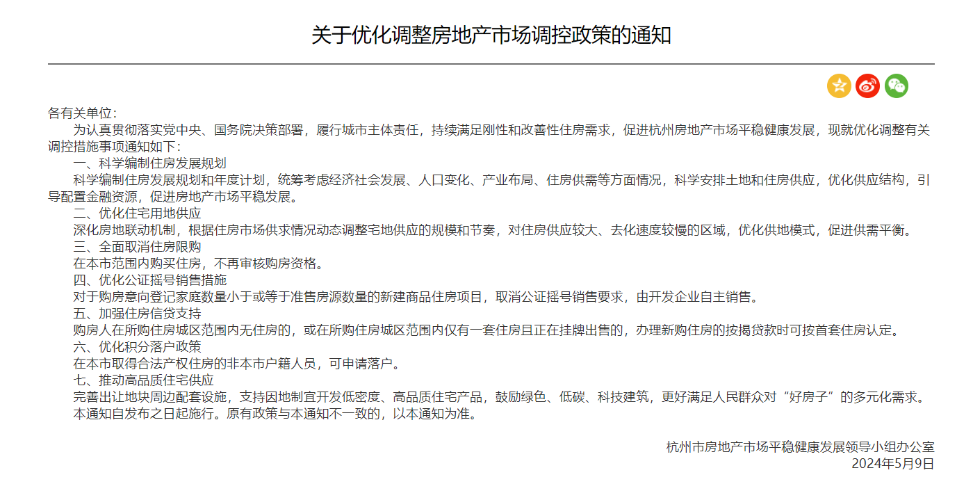5月9日,杭州市房地產市場平穩(wěn)健康發(fā)展領導小組辦公室發(fā)布《關于優(yōu)化調整房地產市場調控政策的通知》(以下簡稱《通知》)。