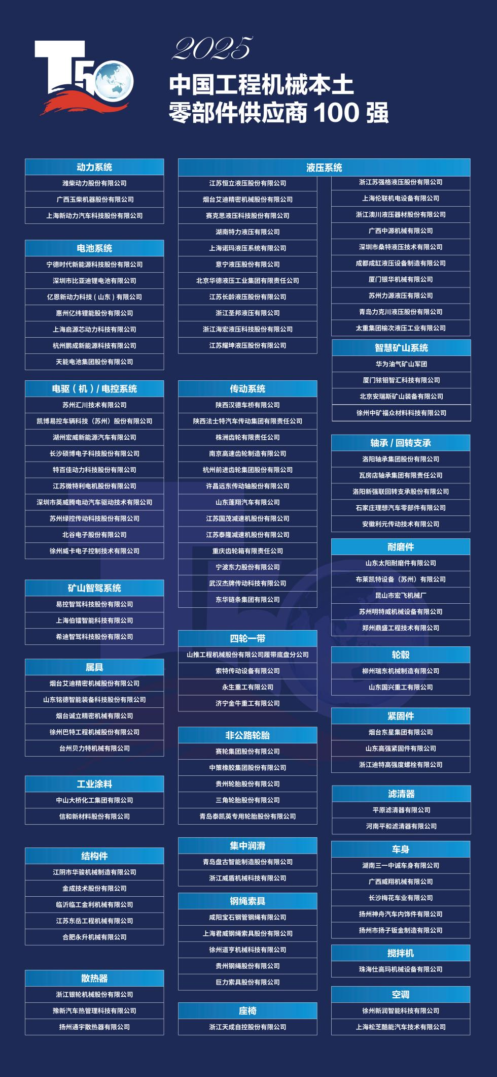 本屆“中國工程機(jī)械零部件供應(yīng)商100強(qiáng)”榜單,除覆蓋動(dòng)力系統(tǒng)、液壓傳動(dòng)、四輪一帶、屬具、結(jié)構(gòu)件、車身、鋼繩索具、涂料等傳統(tǒng)部件外,還增設(shè)了電池系統(tǒng)、電驅(qū)電控、智慧礦山、礦山智駕等前沿領(lǐng)域,共24種細(xì)分品類。