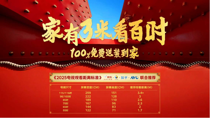 活動(dòng)期間,京東聯(lián)合視像協(xié)會(huì)、知乎、奧維共同發(fā)布《2025電視觀看距離標(biāo)準(zhǔn)》,百吋電視的推薦觀看距離為3米。
