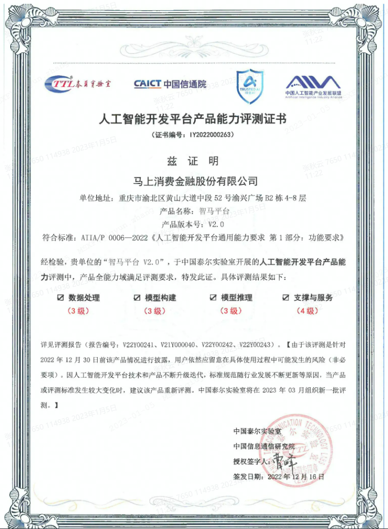 據(jù)悉,該評測主要依據(jù)《人工智能開發(fā)平臺通用能力要求-第1部分:功能要求(AIIA/P0006—2022)》,面向產品提供方和應用使用方,聚焦全棧全流程AI開發(fā)所需功能,對AI開發(fā)過程中所需的167項基本功能和63項高級功能進行評測。馬上消費智馬平臺的數(shù)據(jù)處理、模型構建、模型推理、支撐與服務通過評測,成為國內唯一一家通過全能力域評測的消費金融機構。
