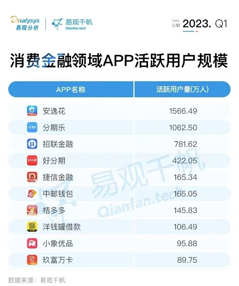 2023年一季度消費金融領(lǐng)域APP活躍用戶規(guī)模TOP10榜單 企業(yè)/供圖