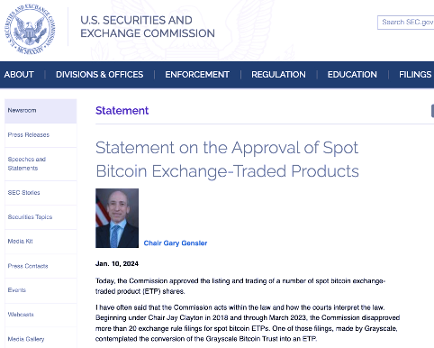 值得玩味的是,SEC主席Gary Gensler在SEC官網(wǎng)聲明中表示,盡管批準(zhǔn)了一些比特幣現(xiàn)貨ETF的上市和交易,但其并未批準(zhǔn)或認(rèn)可比特幣。