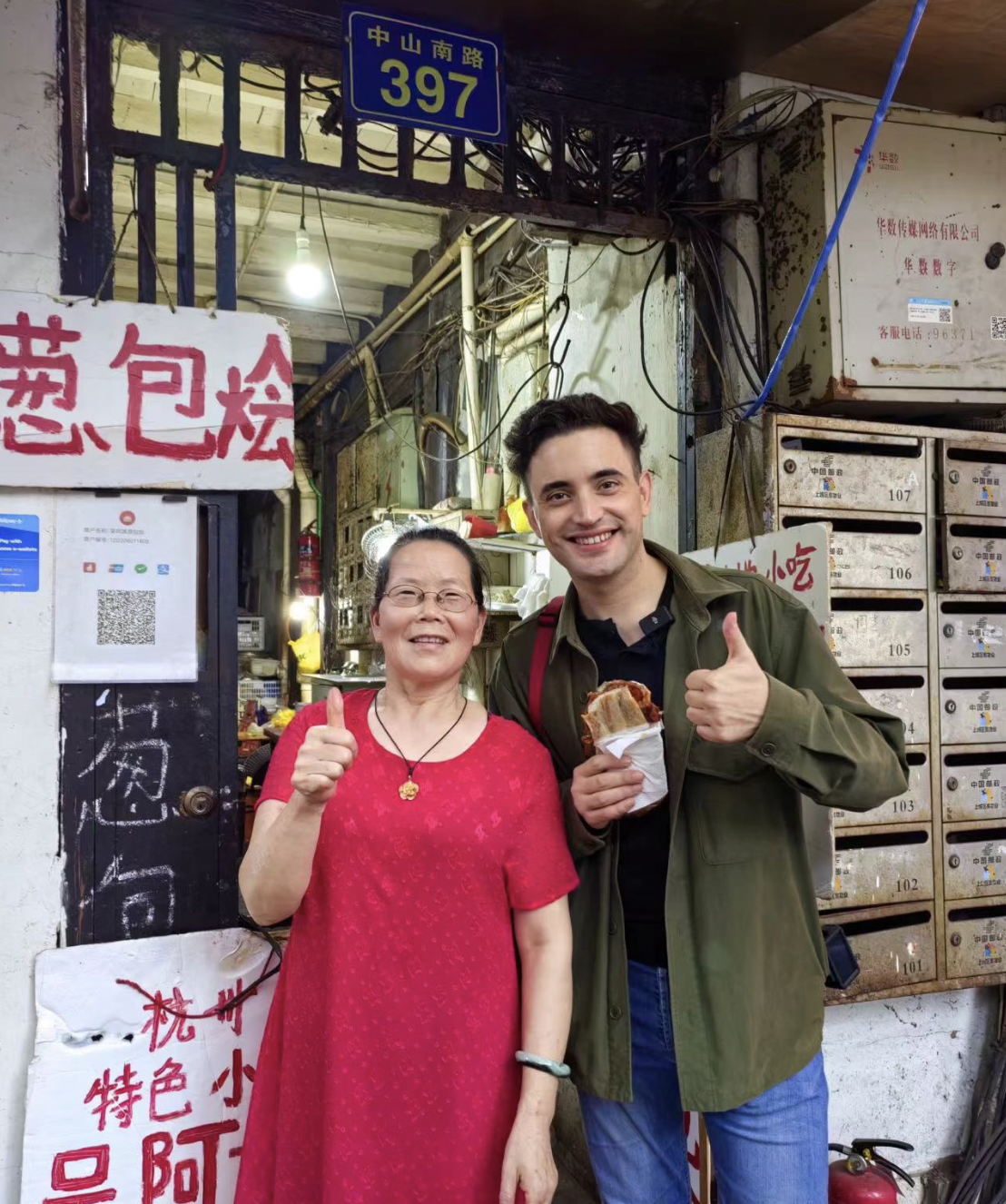 圖為:在西湖邊賣了30多年蔥包燴的吳阿姨在家門口接待全球游客