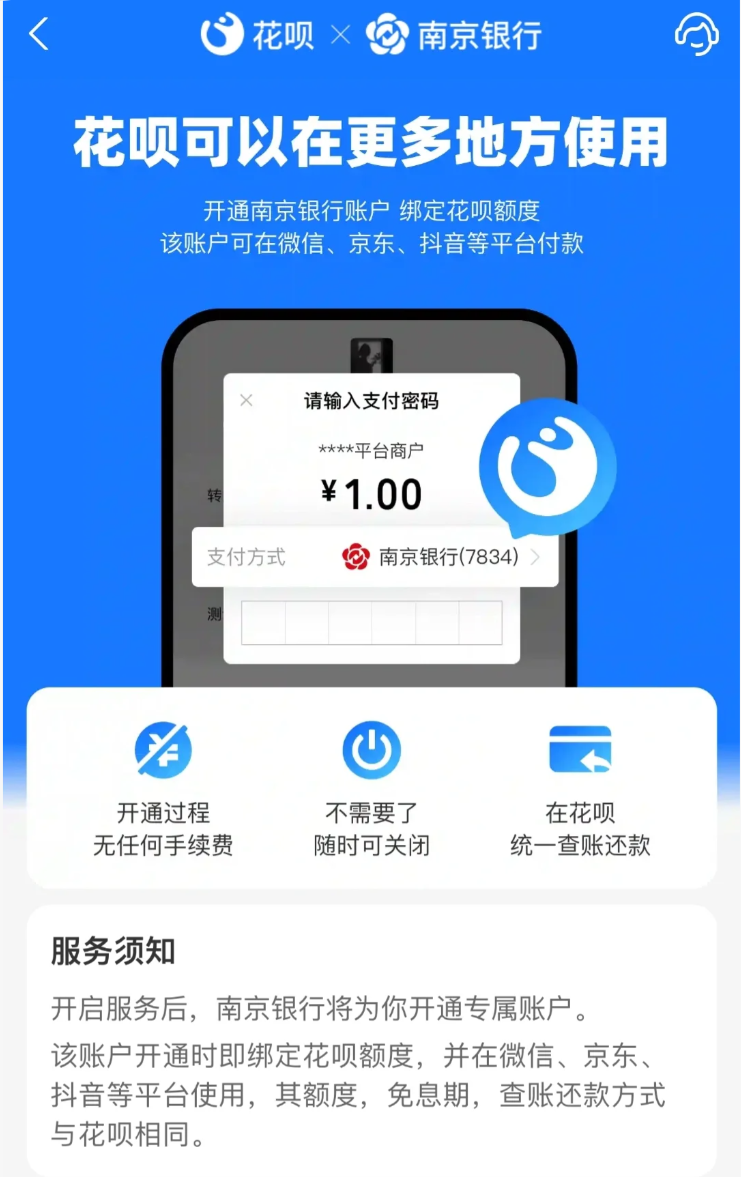據(jù)了解,在花唄里開通一張南京銀行花唄額度專屬銀行卡后,使用該張銀行卡可使用花唄額度進(jìn)行消費(fèi)。目前該服務(wù)已支持綁定微信、抖音、京東等支付平臺(tái)。