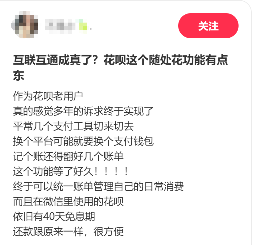 已體驗(yàn)的網(wǎng)友在“小紅書”曬出截圖顯示:“在微信支付里選擇這張卡支付,依舊有花唄40天免息期,還款跟原來一樣,很方便”“多年的訴求終于實(shí)現(xiàn)了,終于可以統(tǒng)一賬單管理自己的日常消費(fèi)。”