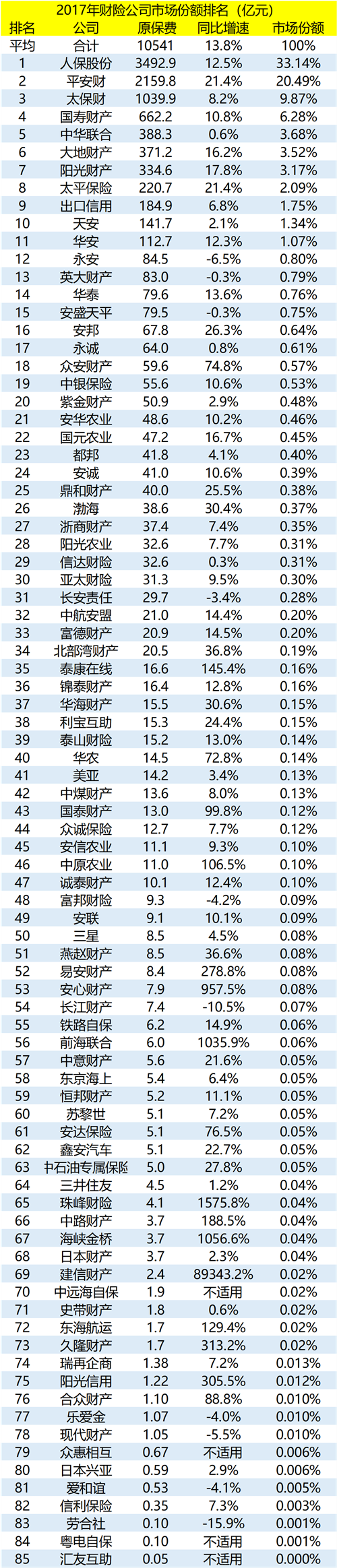 85家財險公司最新保費增速及排名出爐2018-03-14 22:31