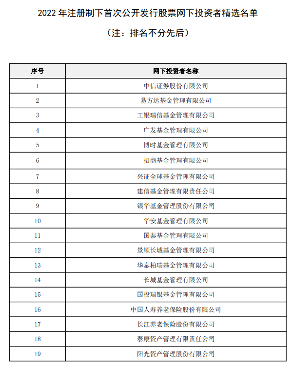 據(jù)悉,根據(jù)《證券發(fā)行與承銷管理辦法》《注冊制下首次公開發(fā)行股票網(wǎng)下投資者分類評價(jià)和管理指引》的有關(guān)規(guī)定,中證協(xié)于2022年6月27日啟動(dòng)2022年注冊制下首次公開發(fā)行股票網(wǎng)下投資者精選名單的申報(bào)工作。經(jīng)過公司自評、協(xié)會復(fù)核、征求意見和信息公示等程序,形成了2022年注冊制下首次公開發(fā)行股票網(wǎng)下投資者精選名單。
