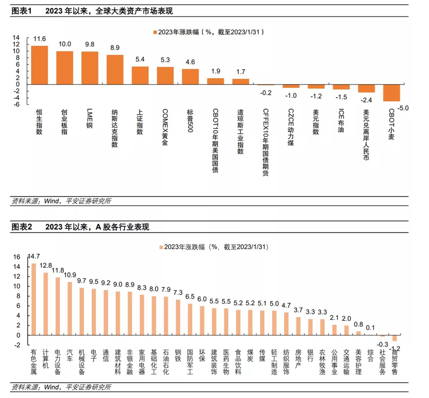 市場的短期邏輯得到了較好的印證和兌現(xiàn)。具體分析來看,第一,長期以來制約市場和經(jīng)濟的疫情因素大幅緩解。2023年疫情將不再成為市場的核心要素,相反疫情之后經(jīng)濟發(fā)展的動能何在,政府、企業(yè)、個人對于經(jīng)濟發(fā)展的訴求將逐漸成為市場的主要關注點;第二,經(jīng)濟在復蘇期有利于權益資產(chǎn)的格局不變。在確認了2022年四季度(受疫情影響)較低的增速之后(投資、消費、進出口全方位的滑落),2023年一季度中國經(jīng)濟正式進入修復及復蘇階段,這不僅僅是預期先行,也是海內(nèi)外的共識(關系到海外資金的持續(xù)流入);第三,結構上出行消費、服務消費先行,投資、制造等領域也將加快投入力度。1月份及春節(jié)期間市場關注的高頻數(shù)據(jù),包括旅游、影視、出行等方面數(shù)據(jù)給予了市場一定的信心,平安證券判斷后續(xù)在制造業(yè)、投資等數(shù)據(jù)上也會出現(xiàn)好的變化。