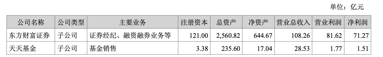 值得關(guān)注的是,東方財(cái)富旗下兩大“王牌”子公司東方財(cái)富證券股份有限公司(以下簡稱“東方財(cái)富證券”)、上海天天基金銷售有限公司(以下簡稱“天天基金”)為其貢獻(xiàn)了不俗的業(yè)績。其中,東方財(cái)富證券為東方財(cái)富貢獻(xiàn)了108.26億元的營業(yè)收入以及71.27億元的凈利潤;天天基金為東方財(cái)富貢獻(xiàn)了28.53億元的營業(yè)收入以及1.51億元的凈利潤。