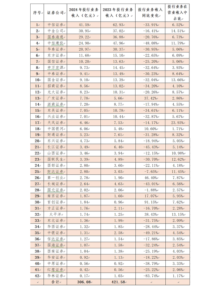 受行業(yè)周期影響,上市券商投行業(yè)務(wù)仍未走出低迷。根據(jù)年報(bào)數(shù)據(jù),42家上市券商2024年投資銀行業(yè)務(wù)共實(shí)現(xiàn)手續(xù)費(fèi)凈收入306.08億元,較2023年的421.58億元,下降27.40%,行業(yè)同比變化中位數(shù)是-25.19%,這反映出投行業(yè)務(wù)收入下滑已經(jīng)成為行業(yè)普遍現(xiàn)象。上市券商中,首創(chuàng)證券、第一創(chuàng)業(yè)證券、太平洋證券、廣發(fā)證券、南京證券、中國(guó)銀河證券等6家投行業(yè)務(wù)收入實(shí)現(xiàn)正增長(zhǎng),占比僅為14.29%。國(guó)元證券、財(cái)達(dá)證券等投行業(yè)務(wù)收入保持穩(wěn)定,而多數(shù)券商投行業(yè)務(wù)則出現(xiàn)較大幅度的下滑。從年報(bào)數(shù)據(jù)還能看出,投行業(yè)務(wù)收入在上市券商整體收入規(guī)模中占比不高,僅有中金公司、中信建投、國(guó)金證券、天風(fēng)證券、山西證券、財(cái)達(dá)證券、太平洋證券等少數(shù)上市券商投行收入在營(yíng)業(yè)收入中占比超10%。