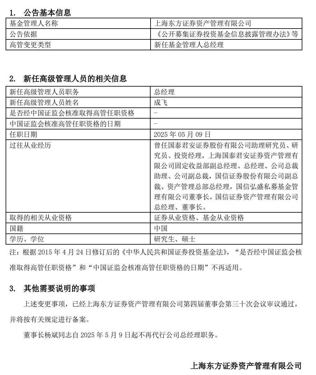 5月9日晚,上海東方證券資產(chǎn)管理有限公司(以下簡稱“東方紅資產(chǎn)管理”)發(fā)布高管變更公告顯示,成飛自5月9日起正式擔(dān)任公司總經(jīng)理,董事長楊斌不再代行總經(jīng)理職責(zé)。