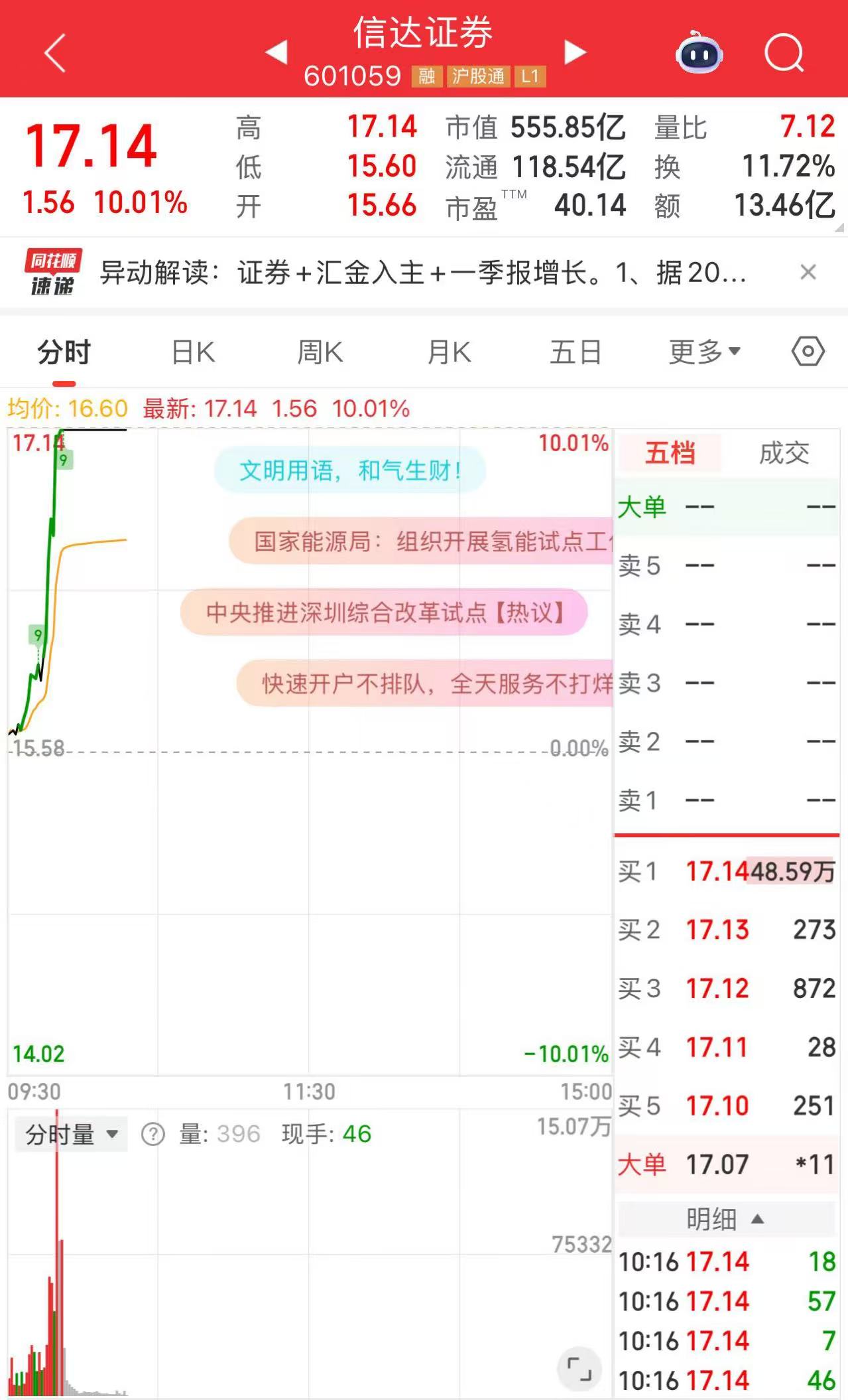 6月11日早盤,券商板塊異軍突起,出現(xiàn)了一波拉升行情。截至記者發(fā)稿時(shí),券商板塊整體漲幅已超2%。從板塊內(nèi)部來(lái)看,個(gè)股全部實(shí)現(xiàn)上漲,其中,信達(dá)證券(A股證券代碼:601059)表現(xiàn)尤為突出,其股價(jià)在盤中強(qiáng)勢(shì)漲停,興業(yè)證券、東興證券漲幅緊隨其后。