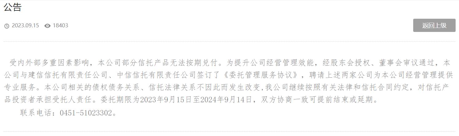 “本公司相關(guān)的債權(quán)債務(wù)關(guān)系、信托法律關(guān)系不因此而發(fā)生改變,我公司繼續(xù)按照有關(guān)法律和信托合同約定,對(duì)信托產(chǎn)品投資者承擔(dān)受托人責(zé)任。委托期限為2023年9月15日至2024年9月14日,雙方協(xié)商一致可提前結(jié)束或延期。”中融信托公告顯示。