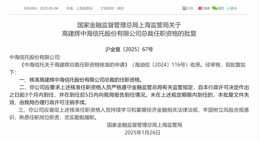 2月6日,國家金融監(jiān)督管理總局上海監(jiān)管局公布相關(guān)批復(fù),核準(zhǔn)高建輝中海信托股份有限公司(以下簡稱“中海信托”)總裁的任職資格。
