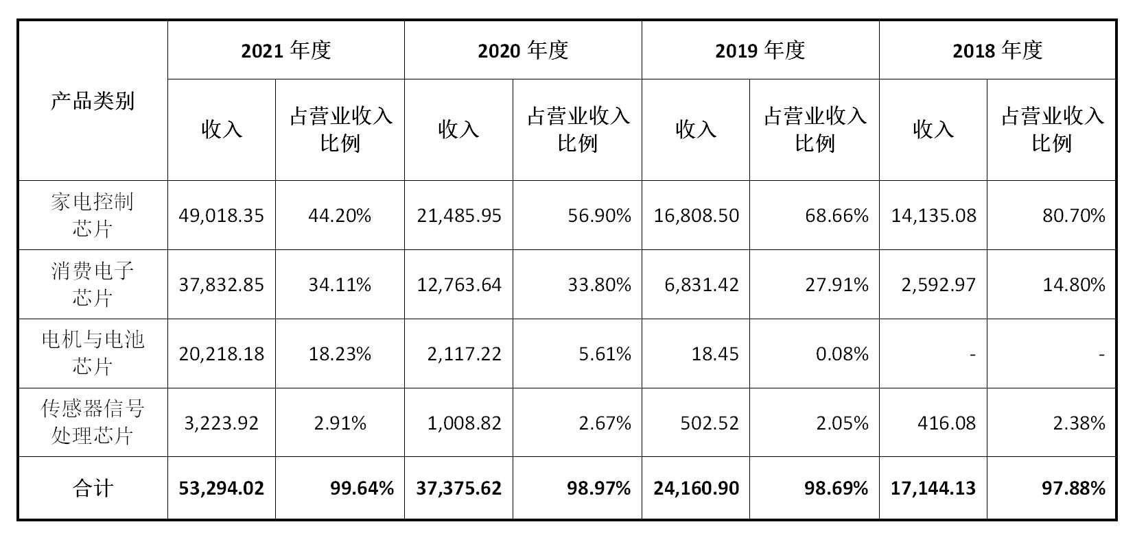 從中微半導(dǎo)的產(chǎn)品構(gòu)成來看,應(yīng)用于熱水器、電磁爐、微波爐等小家電的控制芯片是公司主要營收來源,該部分業(yè)務(wù)收入占比由2018年的80.7%降至2021年的44.2%;應(yīng)用于電動(dòng)牙刷、電子煙和無線充電器等消費(fèi)電子的芯片近年來營收占比逐漸提高,由2018年14.8%升至2021年的34.1%;電機(jī)與電池芯片從無到有,2021年達(dá)到18.2%;傳感器信號(hào)處理芯片占比一直在3%以下。