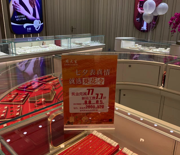 “現(xiàn)在我們的七夕活動(dòng)已經(jīng)開始了,店里的足金飾品都有折扣,按克售賣的飾品每克減77元,按件售賣的彩金類也享受8.8折,還有不少其他的優(yōu)惠都能疊加。”8月1日,《證券日?qǐng)?bào)》記者以消費(fèi)者身份走訪北京一家周大生金店時(shí),銷售人員對(duì)各類金飾產(chǎn)品進(jìn)行了熱情的介紹。銷售人員表示,7月份以來金價(jià)有所下跌,加之臨近七夕節(jié),最近來選購金飾的顧客明顯增多。