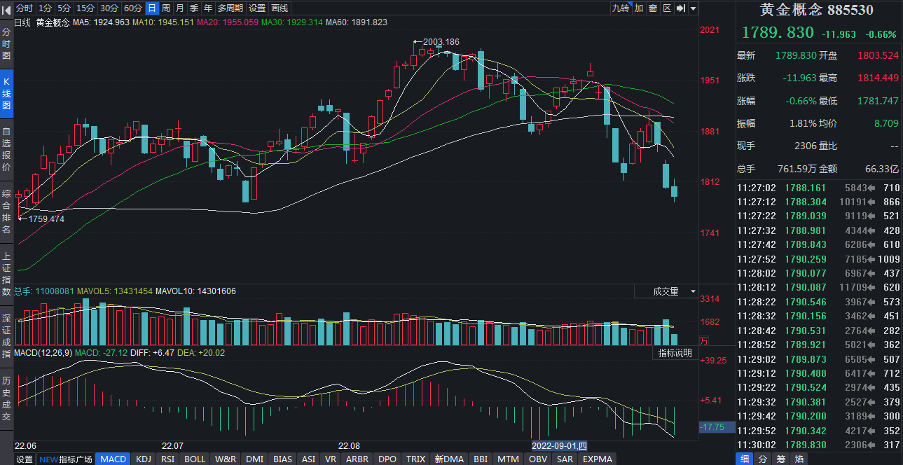 受到國際金價大幅下挫影響,近期A股黃金概念板塊指數(shù)也顯現(xiàn)弱勢。自9月份以來,截至9月26日,黃金概念指數(shù)期間已經(jīng)累計下跌4.92%,期間上證指數(shù)累計下跌4.71%。9月27日,截至11:30,黃金概念指數(shù)則下跌0.66%。