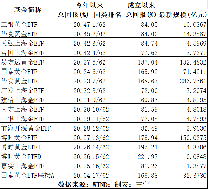數(shù)據(jù)顯示,62只商品型基金中年內(nèi)業(yè)績表現(xiàn)較好的均為黃金主題產(chǎn)品,例如華夏黃金ETF、天弘上海金ETF、國泰黃金ETF、南方上海金ETF和嘉實上海金ETF等17只產(chǎn)品,收益率均超過20%;同時,另有35只黃金聯(lián)接基金年內(nèi)收益也都保持在18%—20%之間。此外,多只豆粕和白銀等主題基金也都實現(xiàn)了正收益。