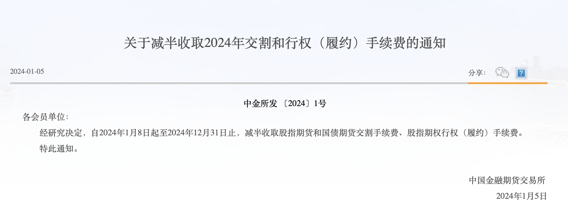 1月5日,中國金融期貨交易所(以下簡稱“中金所”)發(fā)布《關于減半收取2024年交割和行權(履約)手續(xù)費的通知》。
