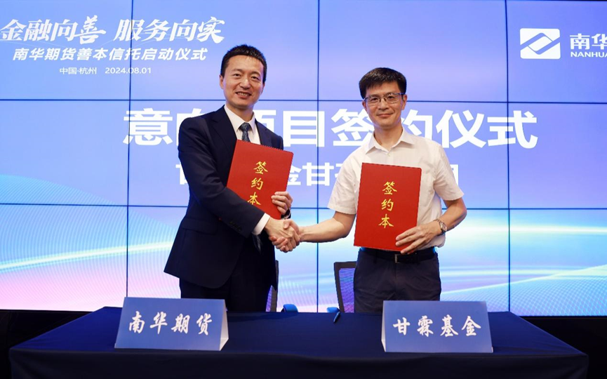 南華期貨總經(jīng)理賈曉龍與杭州甘霖助學基金會理事長鄒峻簽約/公司供圖