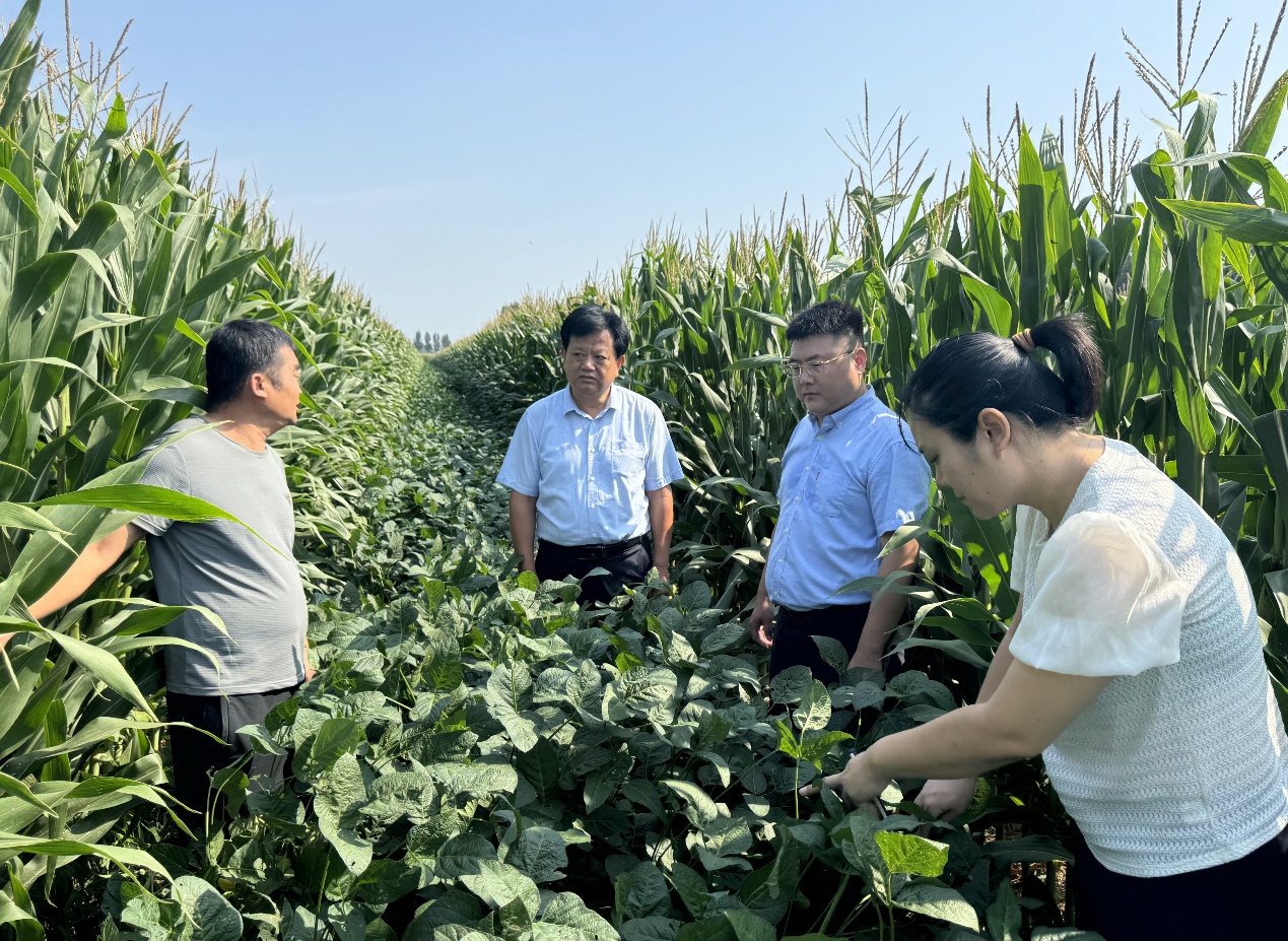 禹城市農(nóng)業(yè)農(nóng)村局、中國人壽財險德州禹城支公司工作人員來到帶狀復(fù)合種植基地,向種植戶了解大豆玉米長勢和相關(guān)農(nóng)產(chǎn)品市場價格情況 王歡/攝