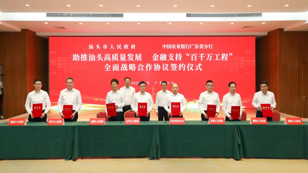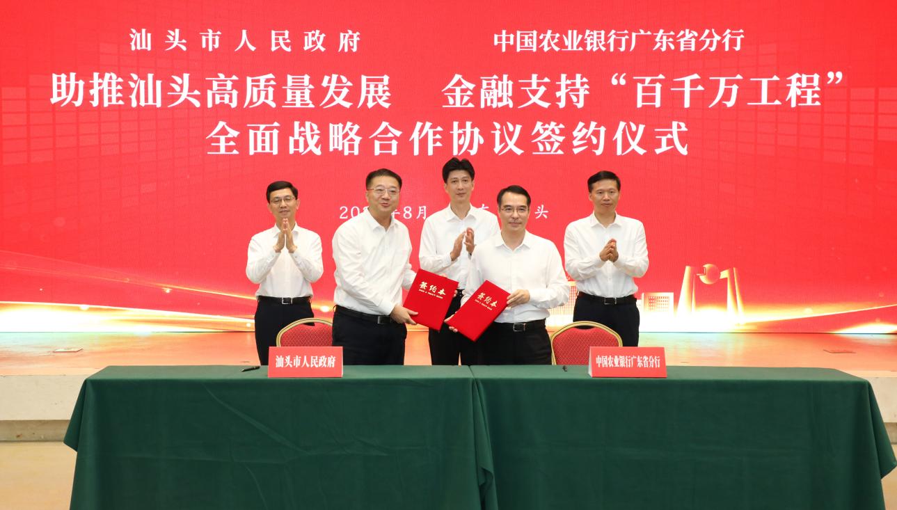近日,農(nóng)行廣東省分行與汕頭市人民政府簽署《助推汕頭高質(zhì)量發(fā)展金融支持“百千萬(wàn)工程”全面戰(zhàn)略合作協(xié)議》。