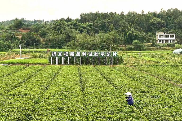 當前正值初秋,在江油市青蓮鎮(zhèn)蘇溪村的田野上,成片的折耳根進入生長旺盛期,好似一幅綠色地毯在田間地頭延伸開來。