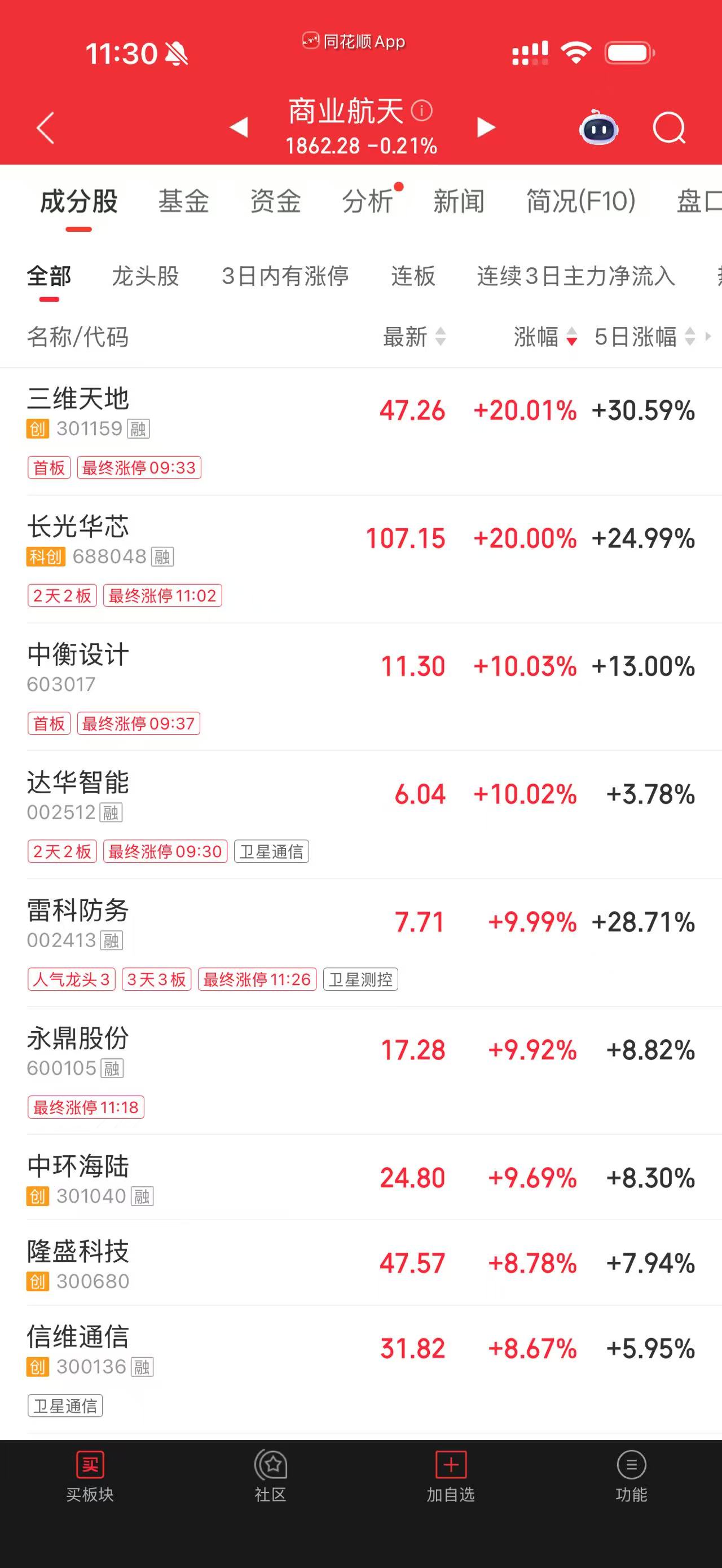 截至上午收盤,三維天地(301159)、長光華芯(688048)達(dá)成“20cm”漲停,中衡設(shè)計(jì)(603017)、達(dá)華智能(002512)、雷科防務(wù)(002413)、永鼎股份(600105)等多股漲停,中環(huán)海陸(301040)、乾照光電(300102)、信維通信(300136)、隆盛科技(300680)等個(gè)股漲超8%。