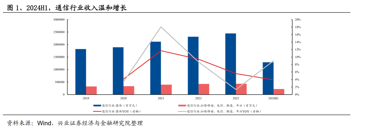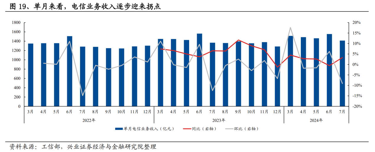 受宏觀經(jīng)濟(jì)波動等因素影響,電信業(yè)務(wù)收入短期有所波動,展望下半年有望逐步迎來拐點。2024年1月份至7月份,我國電信業(yè)務(wù)收入累計完成10354億元,同比+3.0%,按照上年不變價計算的電信業(yè)務(wù)總量同比+11.2%;較去年同期相比增速有所下滑,主要系宏觀經(jīng)濟(jì)波動下傳統(tǒng)通信業(yè)務(wù)增速或有邊際放緩。單月來看,6月電信業(yè)務(wù)收入約1554億元,同比-0.58%,增速由正轉(zhuǎn)負(fù);7月電信業(yè)務(wù)收入約1413億元,同比+3.29%,增速迎來明顯拐點;展望全年,我國電信業(yè)務(wù)總體有望保持平穩(wěn)增長。