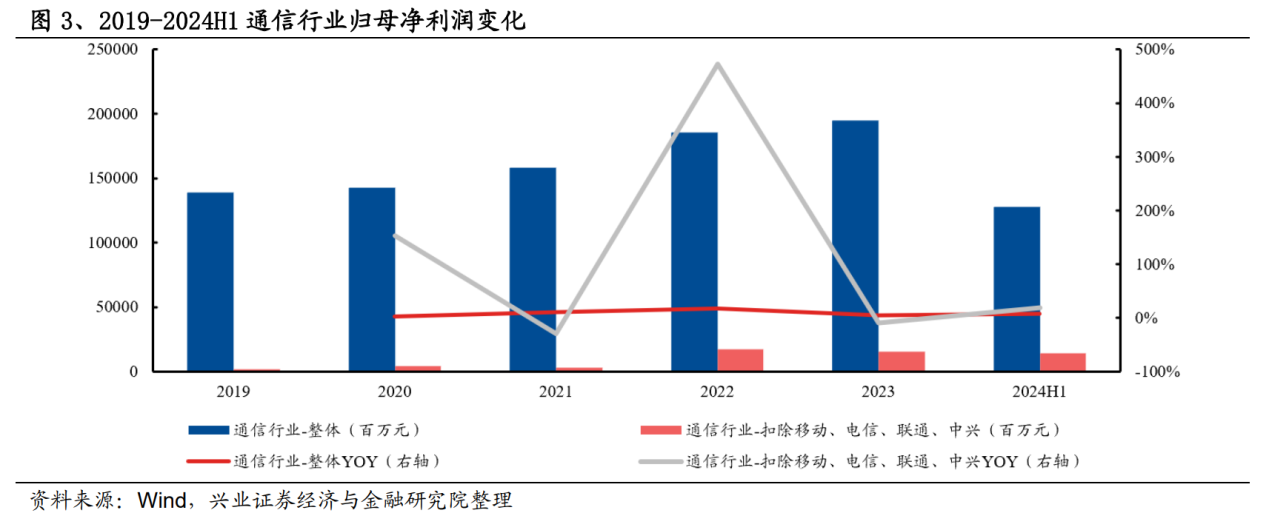 2024年1月份至6月份,三大運營商實現(xiàn)整體營收約10100.58億元,同比增長2.9%,歸母凈利潤1080.52億元,同比增長6.2%;三家運營商通過費用管控、資本開支優(yōu)化等多種方法,整體利潤增速顯著高于收入增速,持續(xù)彰顯傳統(tǒng)業(yè)務(wù)發(fā)展的穩(wěn)定性和戰(zhàn)略轉(zhuǎn)型新業(yè)務(wù)的成效。從每股股息增速來看,中國移動2024年中期每股派息同比+6.0%至2.60港元,股息增長超凈利潤增速;中國電信2024年中期每股派息同比+16.7%至0.1671元,派息率超70%,較2023H1的65%派息率提升明顯,2024年起三年內(nèi)公司將努力將派息率提升至75%以上;中國聯(lián)通2024年每股中期派息同比+20.5%至0.0959元,股息增速顯著高于利潤增速,上半年派息率穩(wěn)步提升至55%。展望下半年,三大運營商預(yù)計繼續(xù)實現(xiàn)穩(wěn)健增長和高分紅,成為通信行業(yè)業(yè)績的“穩(wěn)定器”。